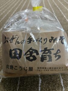 先天性股関節症にお悩みのSさん(行橋市)から無添加天然醸造で知られる吉富町の向野こうじ屋さんの味噌と手作りの梅干を頂きました。